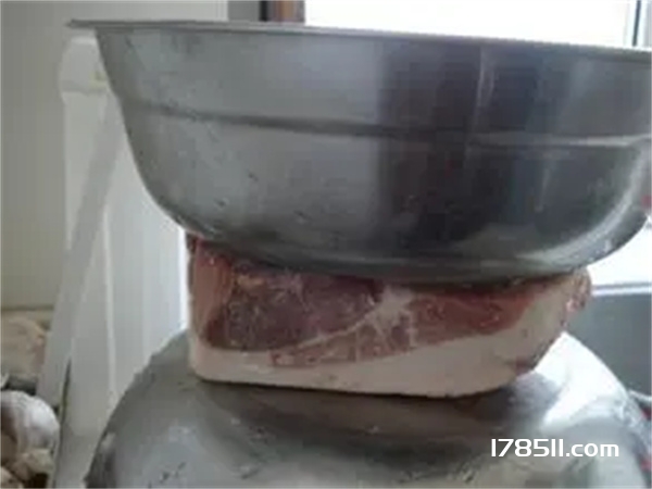 3、如果家里有铝盆,可以把要解冻的肉放在两个干净的铝盆中间,上面的铝盆可以装些水将肉压住,铝制品导热性强,可以很好的加速肉类解冻。