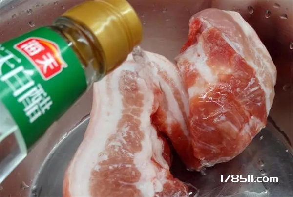 2、在冻肉上倒一点醋也可以起到解冻肉类的作用,醋可以降低冰点,可以加快解冻的时间,还可以让肉质更鲜嫩,解冻完再将醋冲掉就好了。