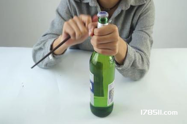 2.筷子打开啤酒瓶。首先,一只手牢牢握住啤酒瓶的瓶颈,另一只手握住筷子的边缘抵住啤酒瓶盖的凹槽。用手握住筷子,用力撬开盖子。