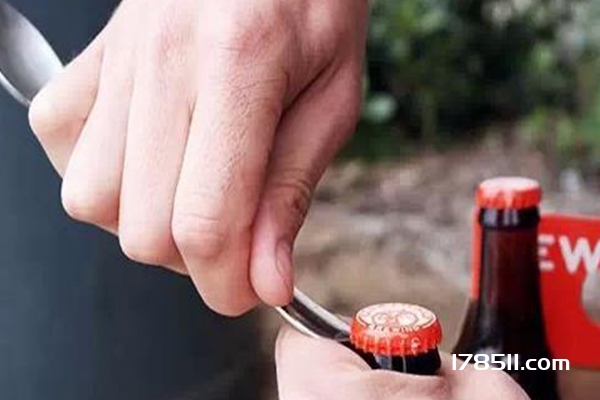 3.勺子打开啤酒瓶。最好用不锈钢勺子。一只手握住勺柄抵住啤酒盖的凹槽,另一只手固定瓶子,这样就可以用力撬开了。