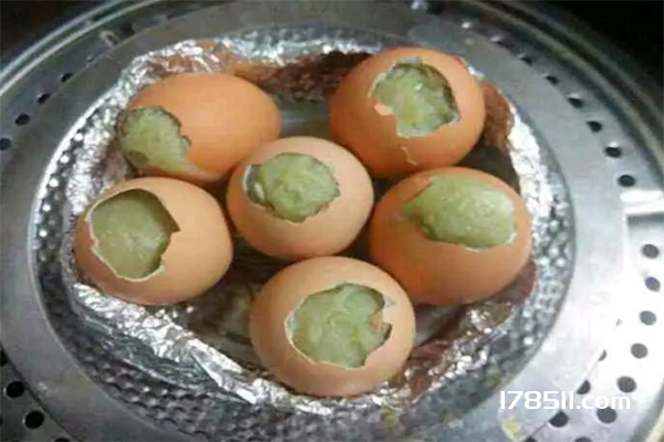 3.检查烹饪效果:晚上鸡蛋全部变绿,就蒸了。可以用筷子扎一下,检查一下是否熟了。