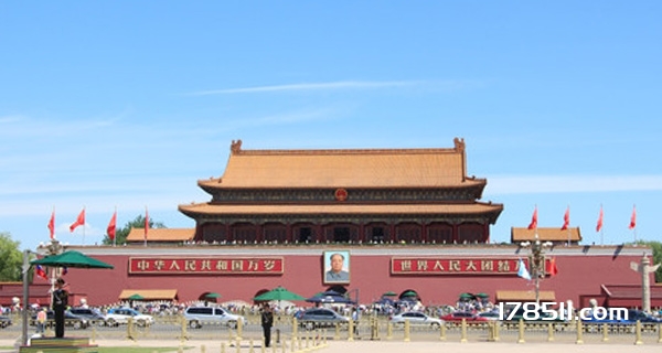 天安门门建于明朝1417年。起初名为承天门,清代改名为天安门门。是明清北京皇城的正门,位于北京皇城中轴线上。