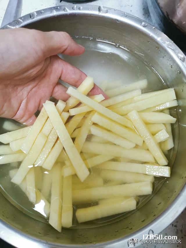 首先,准备一个中等大小的黄心土豆,洗净,切成类似麦当劳里面那种大小的长条状,记得不能切太细。用清水泡一下。(我见到一个切得太细的人炸出来是土豆丝饼[捂脸])