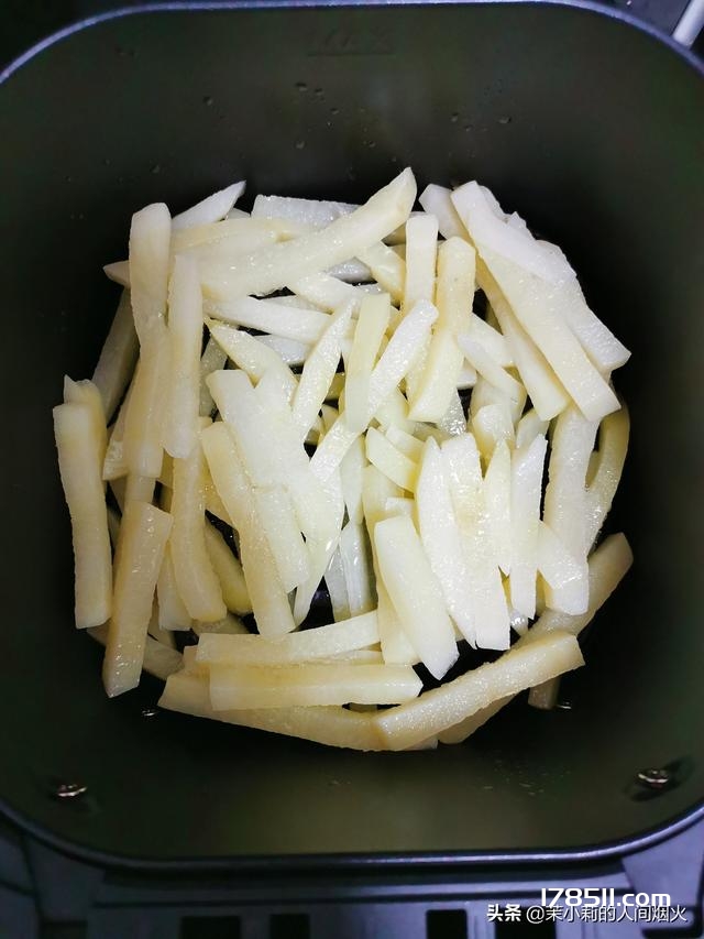 铺好后,均匀喷上油,把空气炸锅调25分钟,180度。开始烤。第15分钟的时候打开,用长筷子把薯条翻一翻,你会发现上面一层已经出现焦糖色了,下面还是白色。所以要翻面烤匀。然后再过10分钟出锅。
