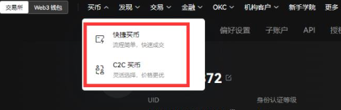 2、通过导航栏【买币】功能,选择“快捷买币”或“C2C买币”中任意一个买币方式;这里我们就以【快捷买币】为举例说明;