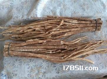 圆柱形,少有分枝,上端略粗。表面灰红棕色,有纵皱纹、横长皮孔及少数支根痕,外皮易脱落,脱落处淡黄色。质硬而韧,不易折断,断面纤维性,并显粉性,皮部黄白色,木部淡黄棕色,射线放射状,形成层环浅棕色。气微,味微甜,嚼之有豆腥味。