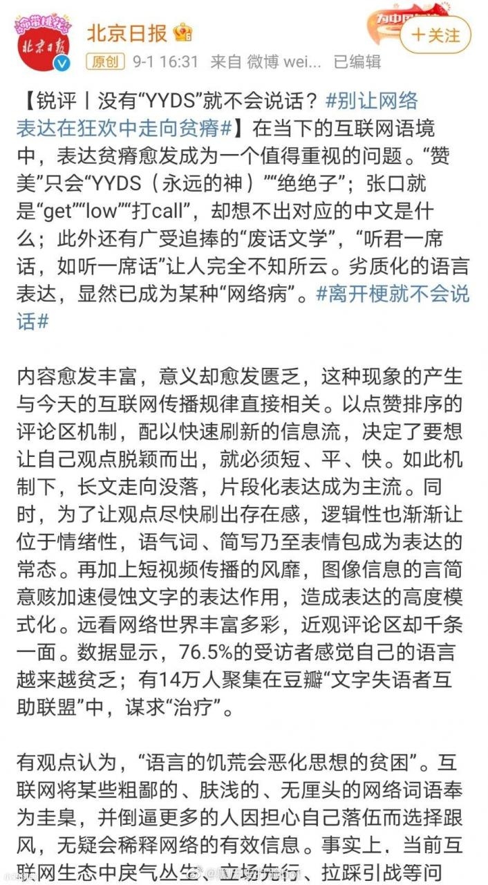 原标题:奶化语言什么意思? 这梗指那些听起来…… 指那些听起来可可爱爱,很柔性的语言,给人一种说这话的人是个人畜无害的宝宝的感觉。 典型特征有:使用叠词、结尾加个“子”、高频率使用颜文字和emoji谐音词语中的某一个字。都是我猜的典型代表就是网红体。 出自9月1日新华每日电讯的文章,这篇文章痛批了当代网络流行语使人们的语言表达能力下降,无法用文字自如表达想法,并提出了三点