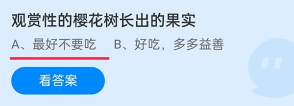 原标题:知羞草遇到刺激和触碰为什么能够自动合拢 支付宝蚂蚁庄园每天都为大家准备了题目,2021年11月21日的题目:观赏性的樱花树长出的果实?想必大家很想要知道,下面小编就为大家带来了今日蚂蚁庄园答案介绍。 今日答案 问题:观赏性的樱花树长出的果实? 答案:最好不要吃 答案解析 观赏花朵的樱类,它们所结的果实大多都不堪食用,所以我们常常观赏的樱花到底是结不出我们所吃的樱桃的。