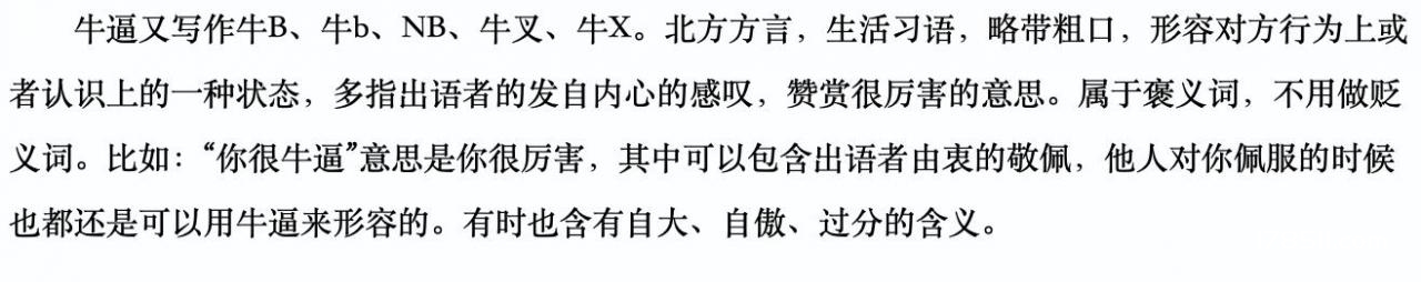 从今天的字面意思上来说,牛逼是褒义词,它是夸人的话,比如说形容一个人厉害时,就会说他很“牛逼”,不过有时候人们在运用这个词的时候,也会带入到贬义中,比如说“某人太会吹牛逼了”等,不过大多数情况下,牛逼都是褒义,也会被写作牛B、牛X、流弊、牛批等,是一种很常见的生活用语。